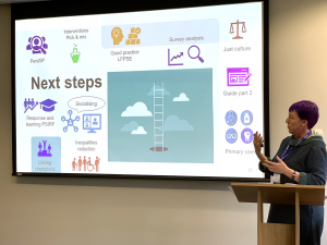 Hester also highlighted the need for developing nuanced understandings around organisational safety cultures and safety work as it pertains to (and/or is understood within) different care settings and different professional groups. Furthermore, emphasising the importance of the use of co-production in developing effective initiatives around positive patient safety culture change, she identified the PSRCs as presenting a good opportunity for undertaking co-production and co-design activities. Hester’s insightful and engaging talk was followed by a lively group discussion around issues pertaining to the operationalisation of patient safety cultures, capturing and inclusion of the patient voice when defining and determining organisational cultures of safety, and the challenge of implementing positive cultural changes in the context of constrained resources and increasing pressures on health and care staff.