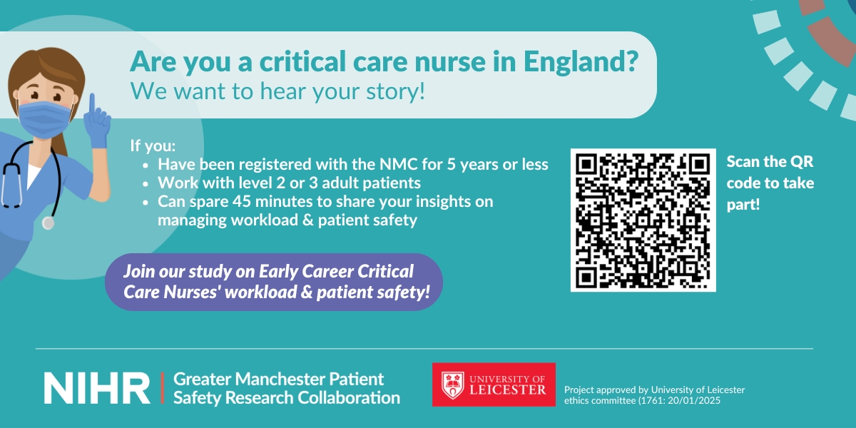 As part of our Enhancing Cultures of Safety research theme, we are seeking early career nurses working in critical care units in England who can spare 45 minutes for a confidential one-to-one online interview. By taking part and sharing your insights, you’ll be helping to shape our study on Early Career Critical Care Nurses’ Workload and Patient Safety.