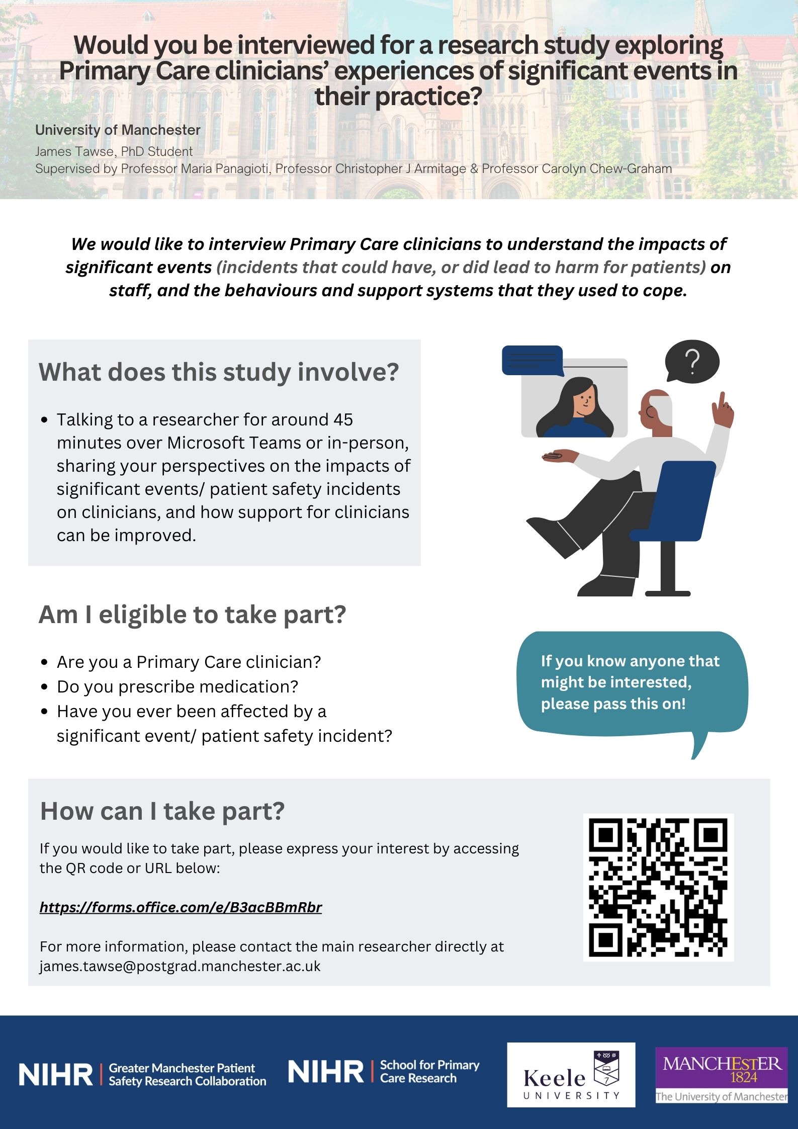 This is study is led by James Tawse, PhD Candidate at University of Manchester, funded by NIHR Greater Manchester Patient Safety Research Collaboration and NIHR School for Primary Care Research. Supervisors: Professor Maria Panagioti, Professor Christopher J Armitage and Professor Carolyn Chew Graham.